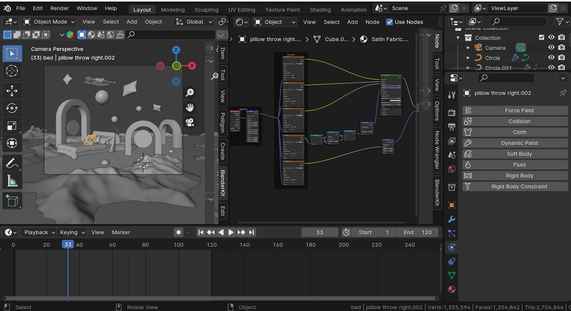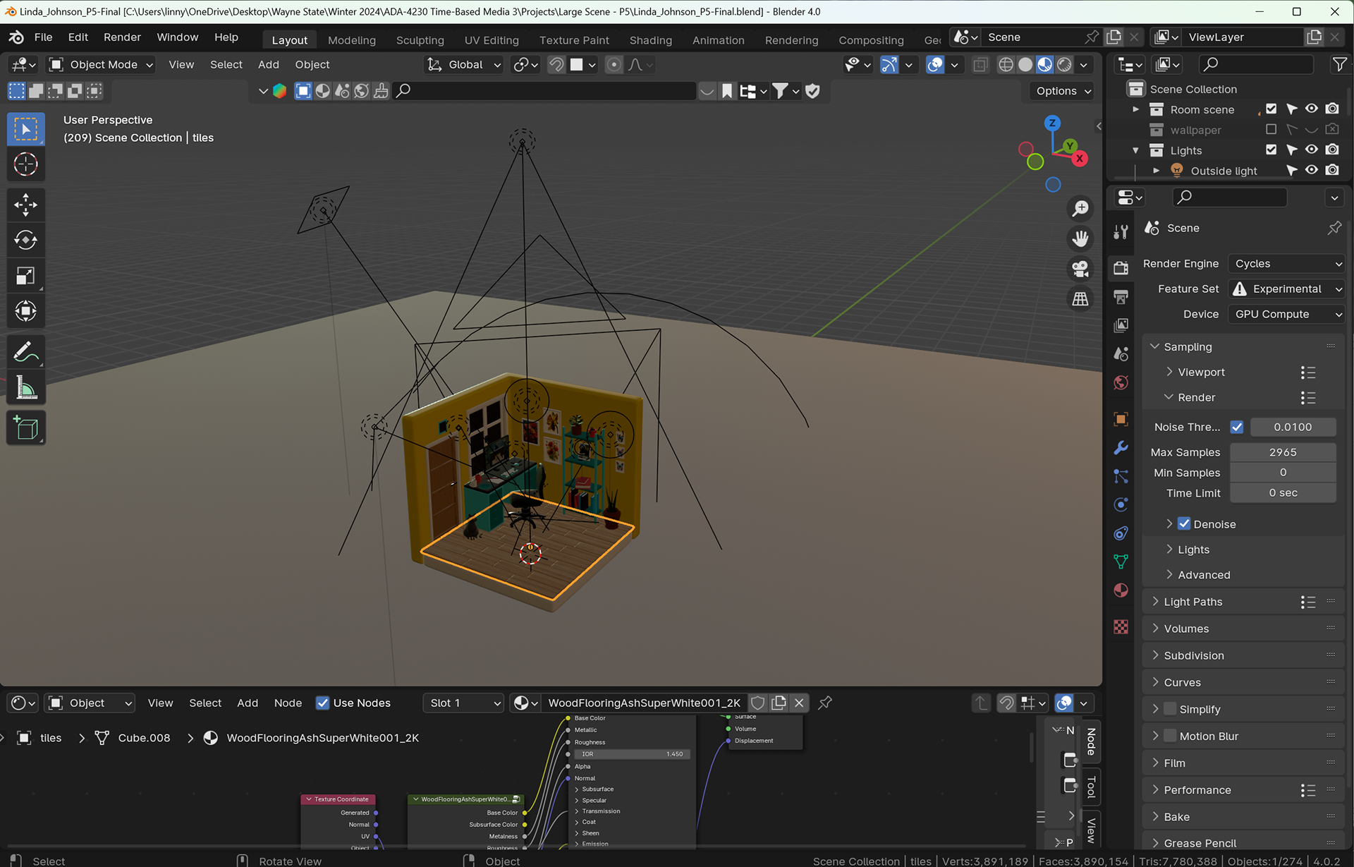A whimsical landscape poster created in Blender for a design assignment. This project experiments with lighting, composition, and mood to create a surreal, imaginative environment. One image shows the final rendered poster, and the other shows a screenshot of the Blender scene to highlight the 3D work behind the composition.