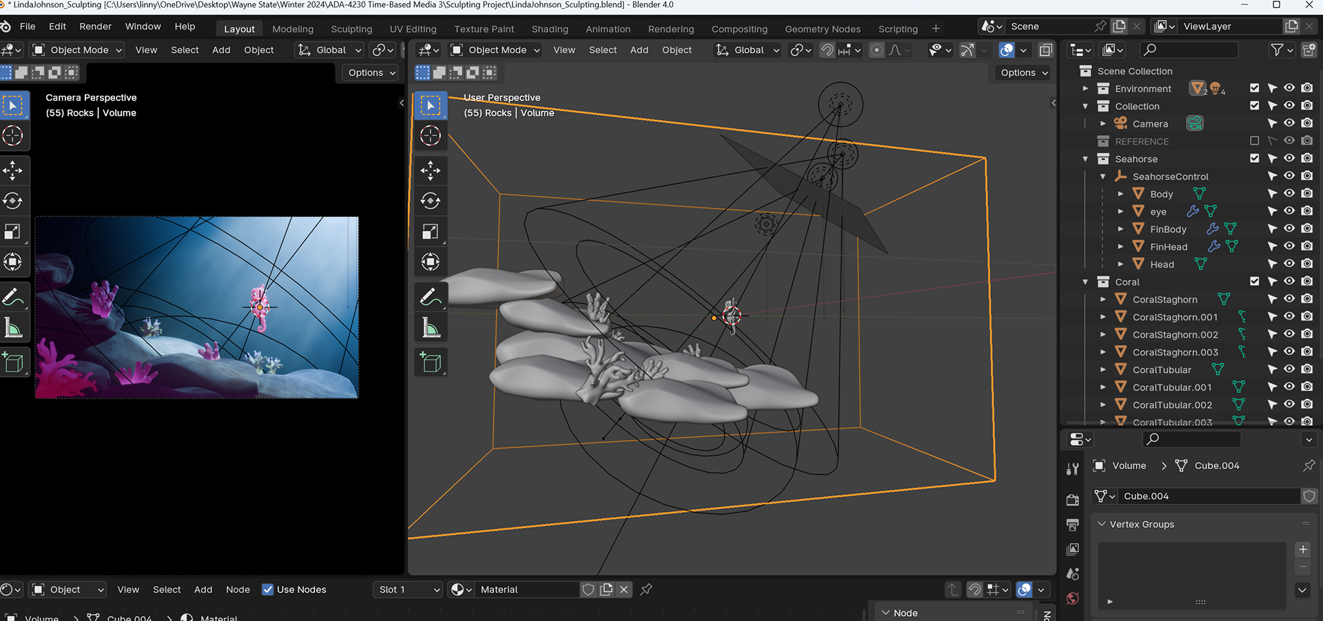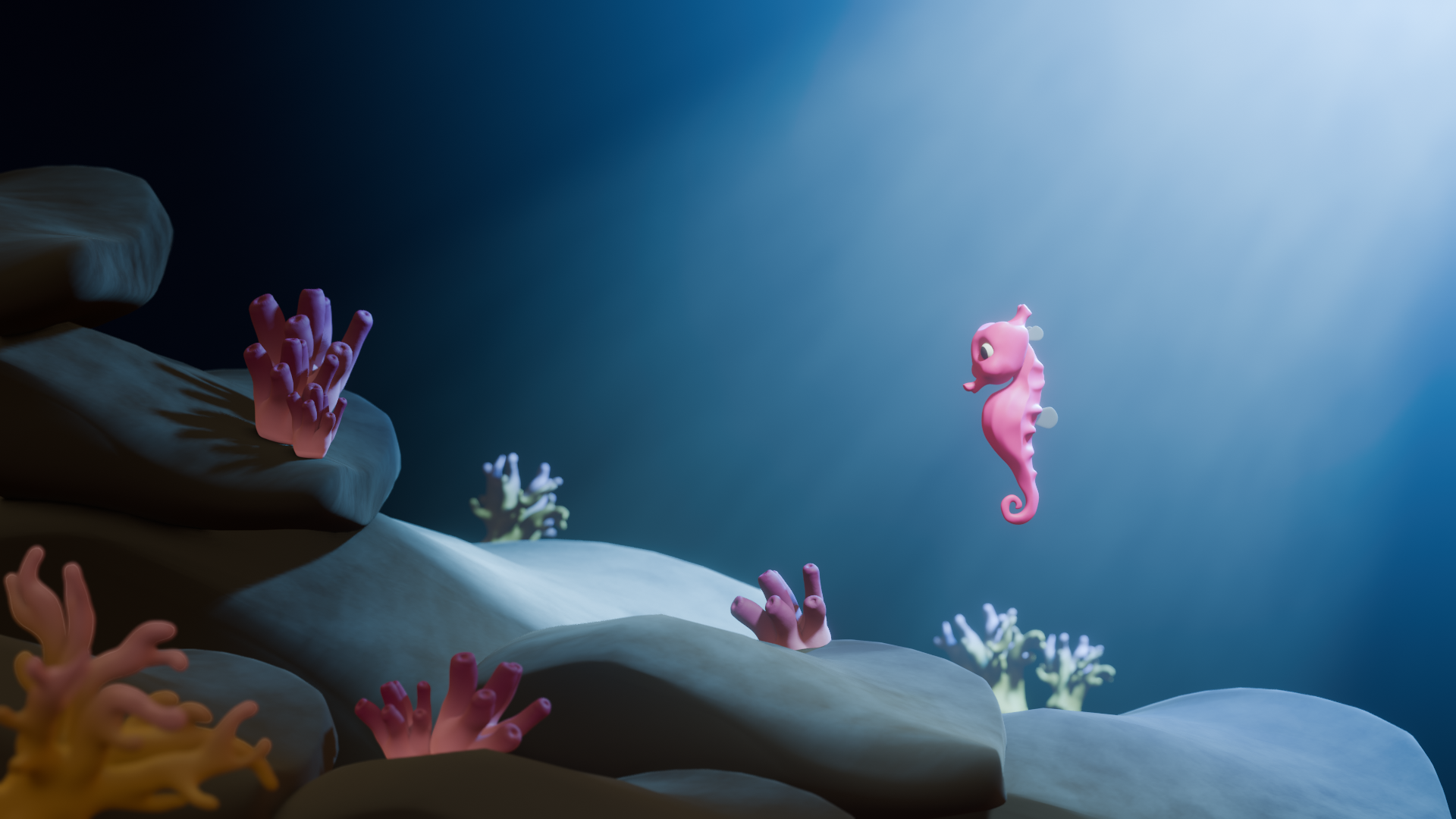 A small, playful underwater scene featuring a cartoony seahorse. This project explores environment modeling, sculpting, creative lighting, and stylized design within Blender. Two images capture both the final render and a screenshot of the 3D scene.