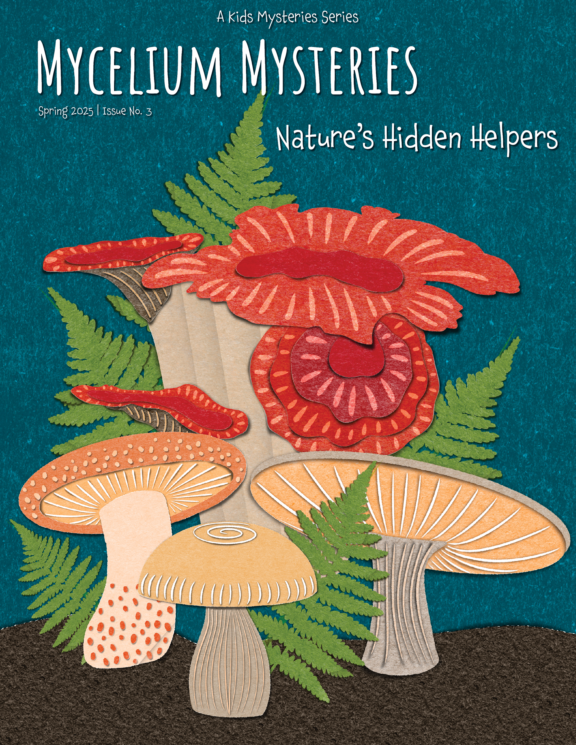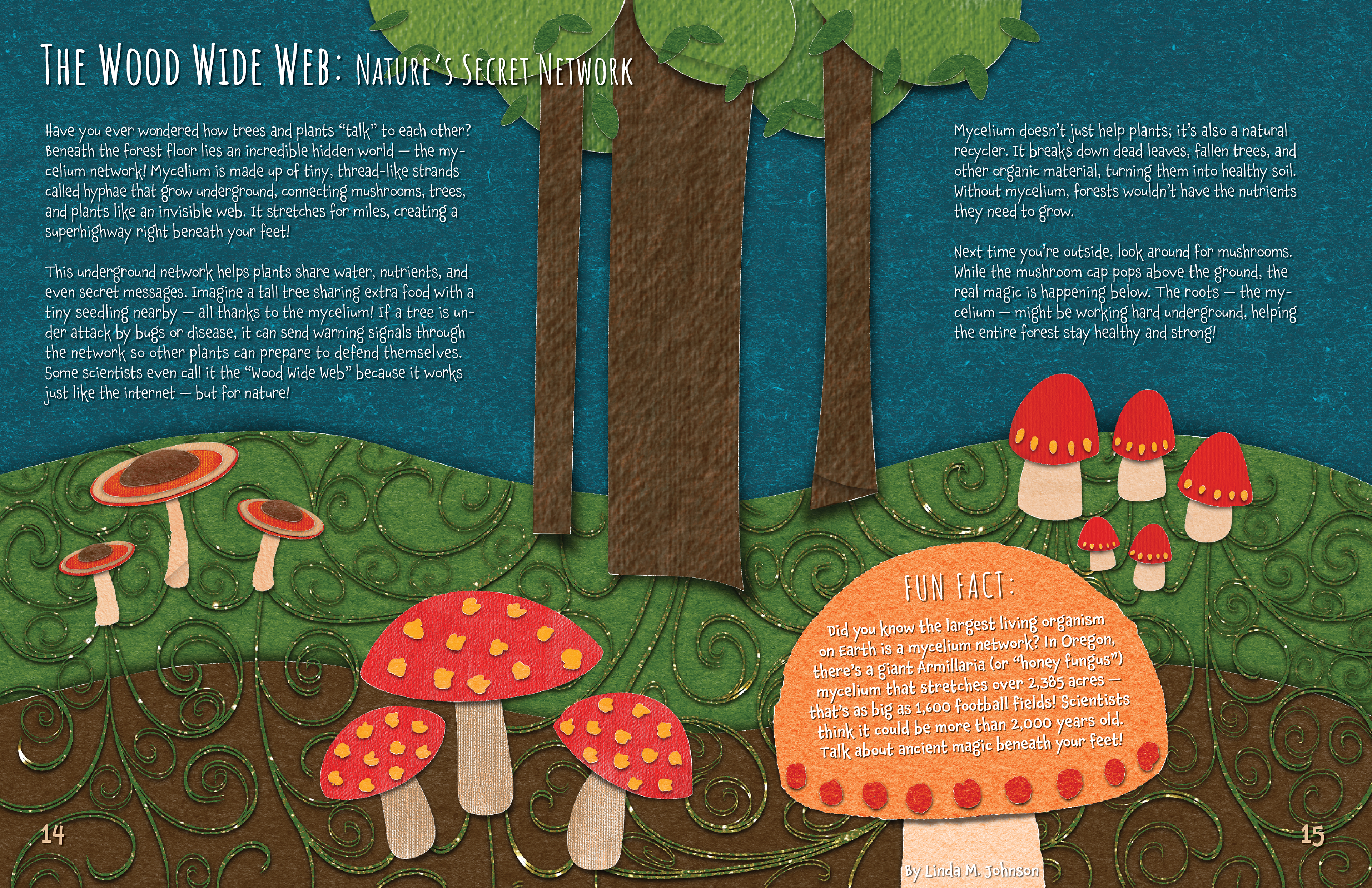 Mycelium Mysteries (Cover & Spread): Educational children's magazine concept combining storytelling, science, and playful paper-craft style illustration. Created in Procreate, then finalized in InDesign to add text and prepare for print.